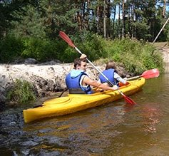 Posiadamy kajaki dwuosobowe, wykonane z tworzywa polietylenowego o długości 395 cm i szerokości 83 cm, waga 33 kg, ładowność 230 kg. Ze względu na nieduże gabaryty kajak jest idealny na wąską rzekę. Na wyposażeniu tjest również dodatkowe trzecie miejsce dla dziecka
